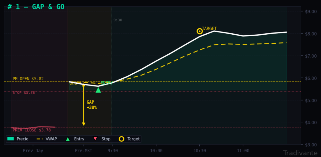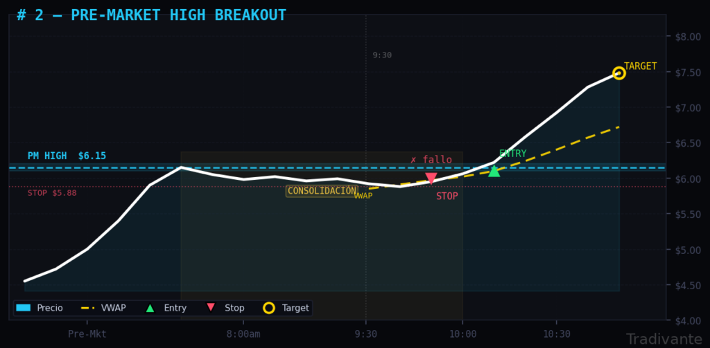 A diferencia del Gap & Go, aquí esperamos a que el precio forme un máximo claro durante el pre-market, consolide cerca de ese nivel, y luego lo rompa con volumen durante la sesión regular.