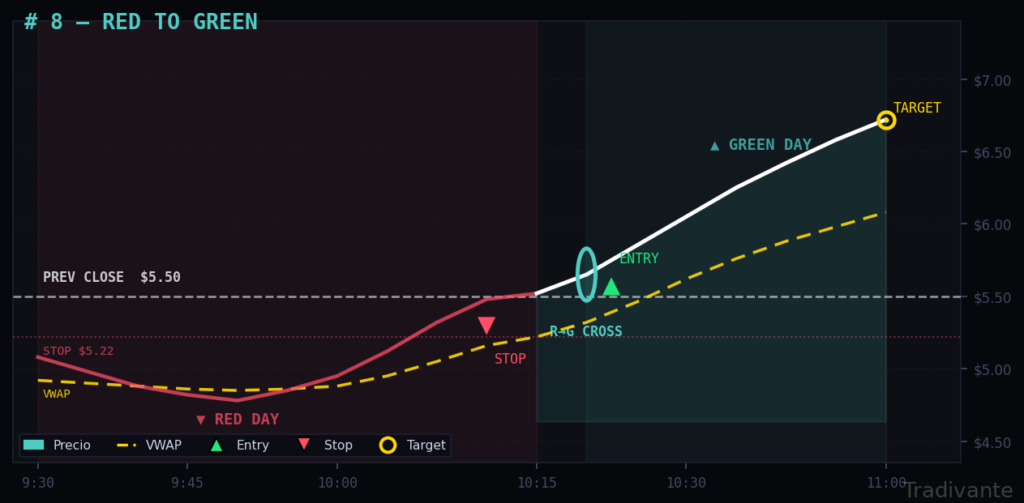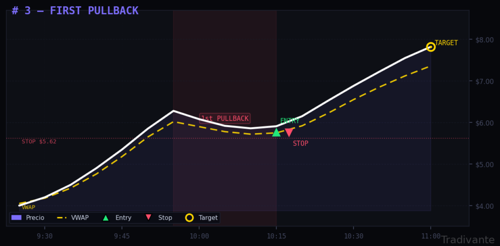 El complemento natural del Gap & Go. Una vez que el precio ha hecho su rally inicial desde el open y muestra las primeras velas rojas, el primer retroceso es una oportunidad de entrada con la tendencia ya confirmada y a mejor precio.