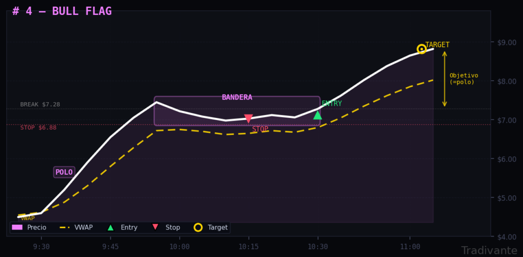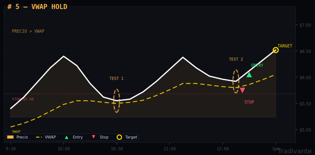 Más fiable en días con catalizador, cuando el precio lleva al menos 90 minutos por encima del VWAP antes del primer test.