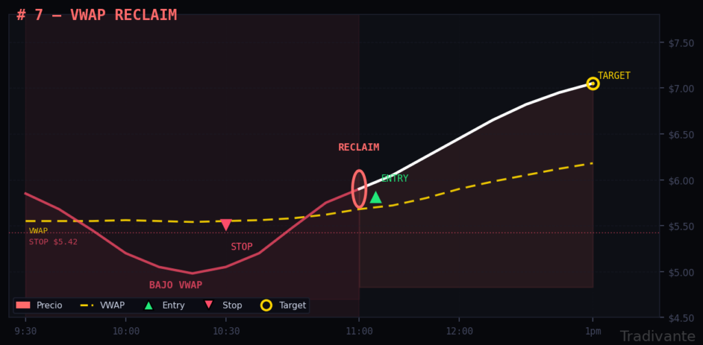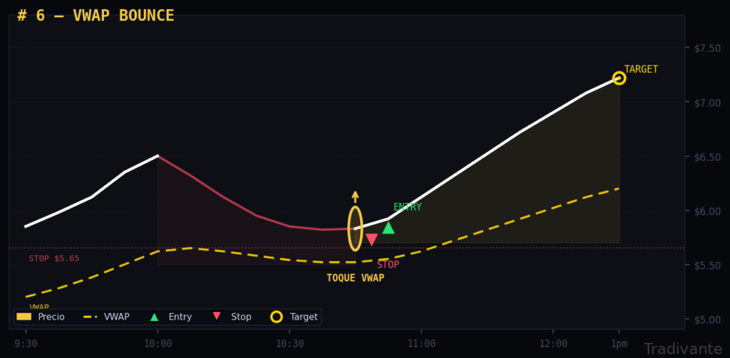 El precio ha caído por debajo del VWAP y luego lo recupera con una vela fuerte y con buen volumen. Es una señal de reversión intraday y suele darse bien avanzada la sesión.