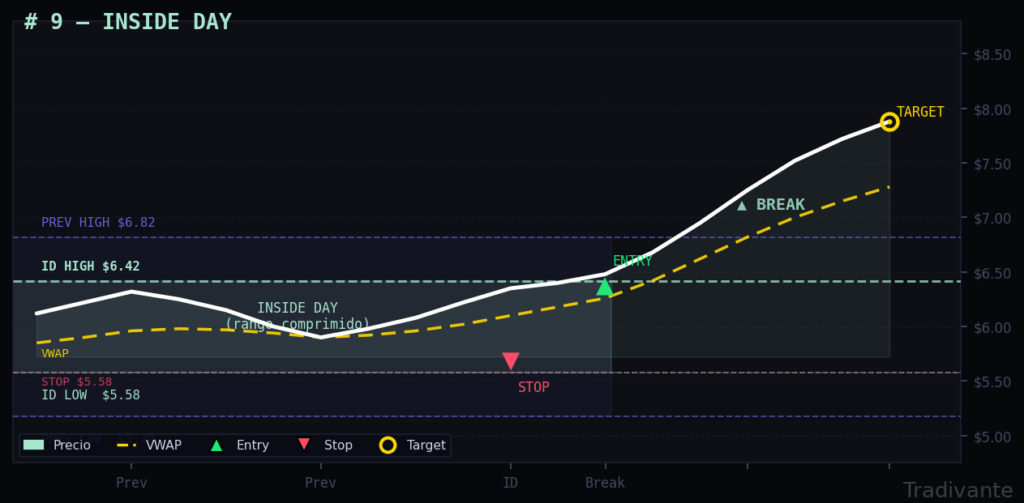El rango del día actual queda completamente contenido dentro del rango del día anterior. Esta compresión de volatilidad suele preceder a un movimiento explosivo en uno u otro sentido.