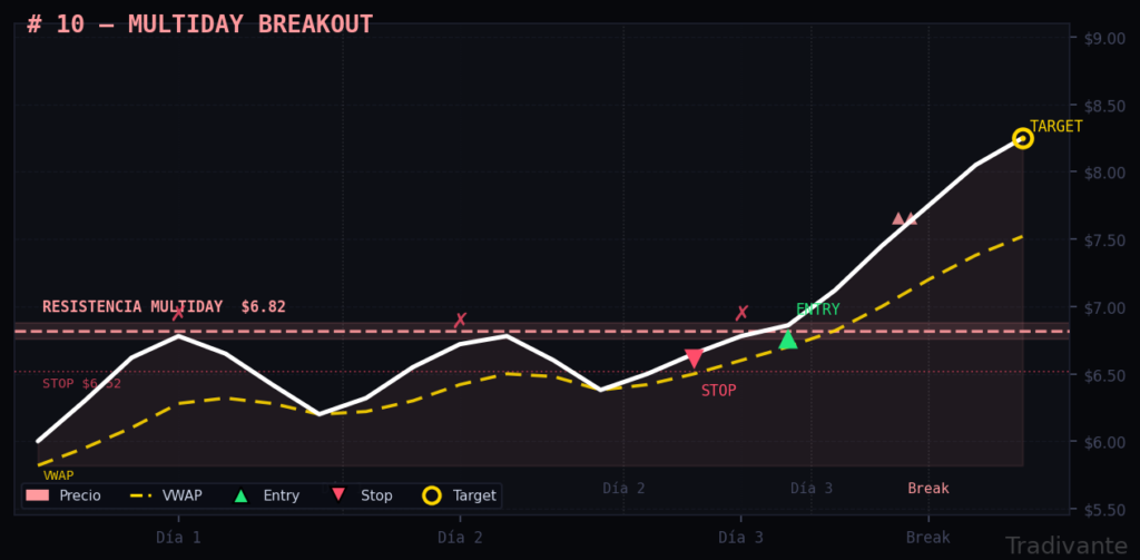 Una resistencia testeada en dos o más días consecutivos sin romperse concentra por arriba muchos stops de shorts. Cuando el precio la supera con volumen, el movimiento alcista puede ser muy rápido y extenso.