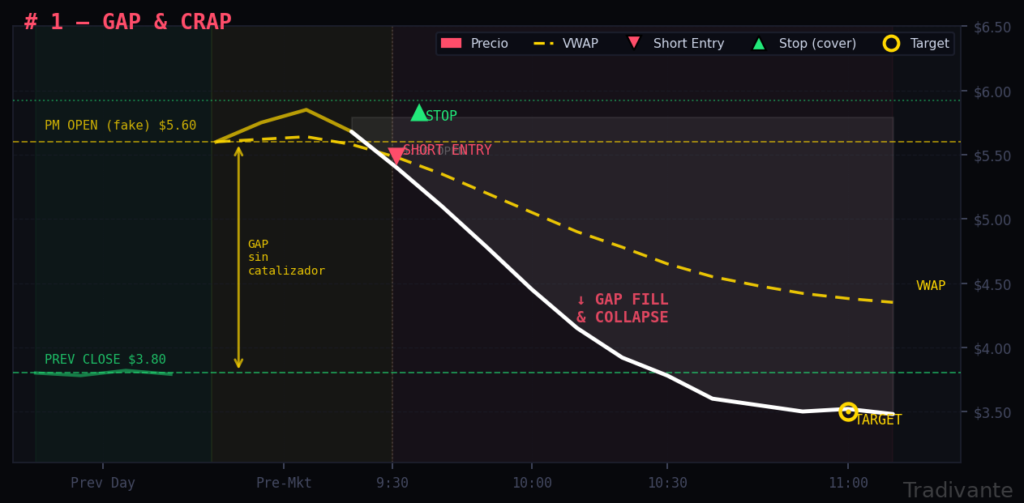 El espejo del Gap & Go. El precio abre con un gap alcista, pero el catalizador es débil, inexistente o ya está descontado. El volumen pre-market es escaso. En lugar de continuar subiendo, colapsa durante la mañana, cerrando el gap y frecuentemente cayendo por debajo del cierre anterior.
