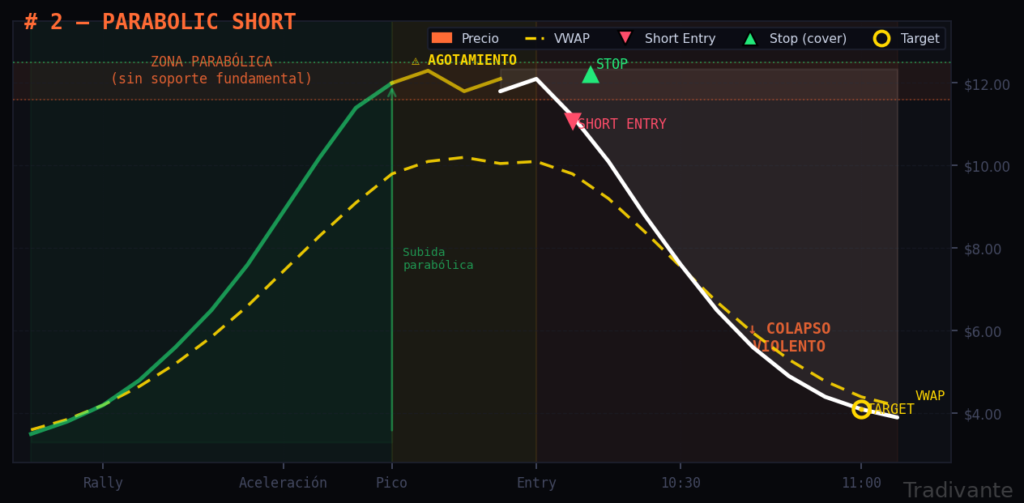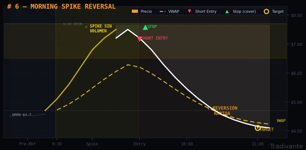 Se da en pre-market o justo tras la apertura, y se entra al cierre de la primera vela que muestre reversión tras el pico. Requiere rapidez de ejecución.