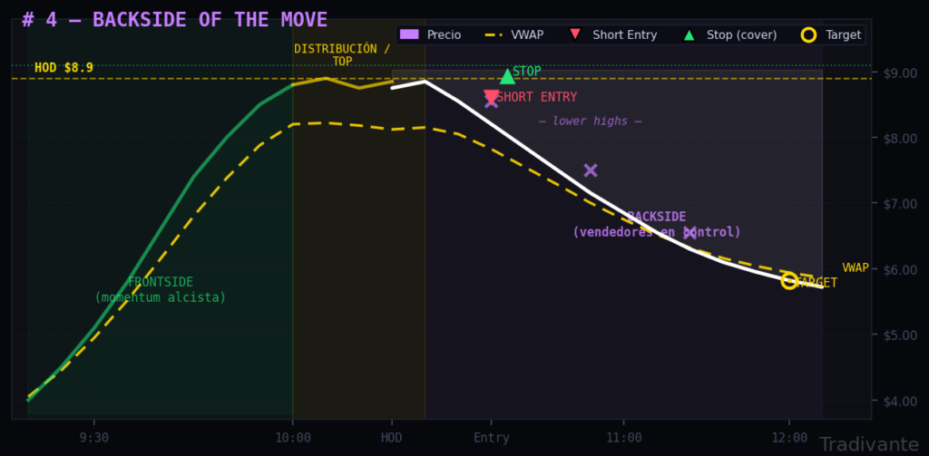 Una entrada válida puede ser en el primer lower high confirmado tras el HOD, o en el primer rechazo del VWAP tras haberlo perdido.