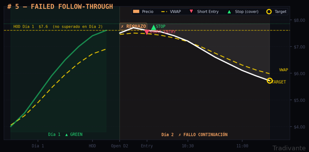 La entrada es cuando el precio del día 2 testea el HOD del día 1 y es rechazado, o cuando pierde el VWAP del día 2.