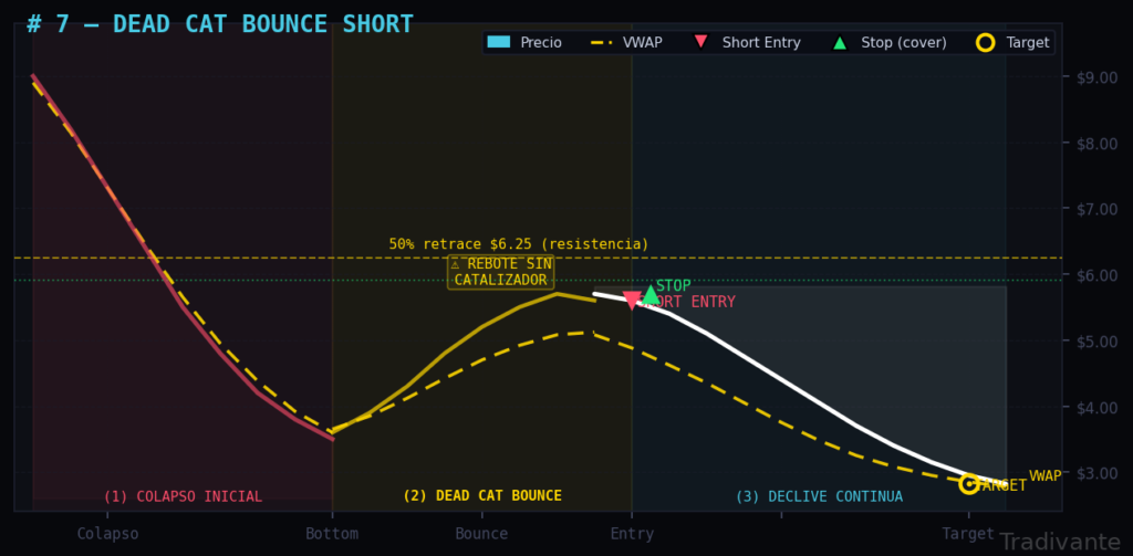 Tras una caída brutal y rápida, por un halt, dilución o noticia muy negativa, el precio rebota un 20–40% sin un catalizador real. Cuando ese rebote se agota, el precio reanuda la caída estructural.