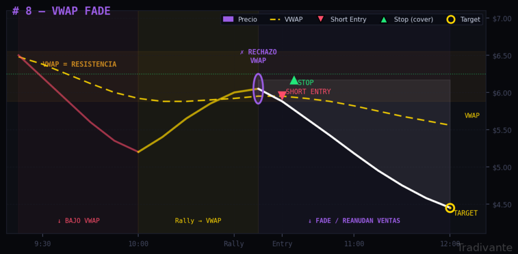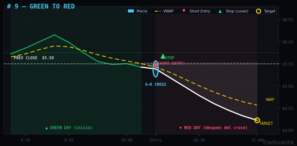 Se entra cuando el rebote muestra señales de agotamiento cerca de una resistencia relevante (VWAP, 50% de retroceso, prev close) y aparece la primera vela bajista fuerte.