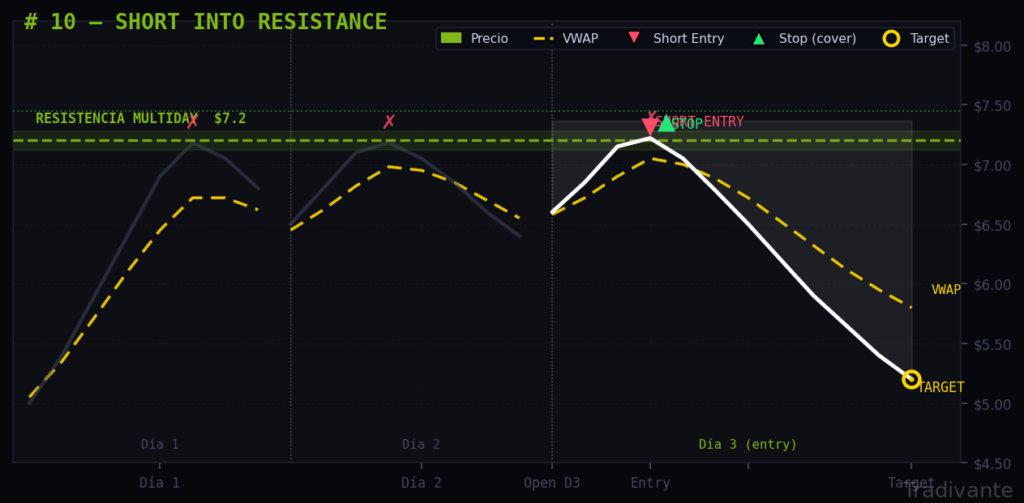 Una resistencia de múltiples días testeada varias veces sin romperse concentra vendedores. Cuando el precio regresa a ese nivel, se entra short con stop por encima y target en los soportes siguientes.